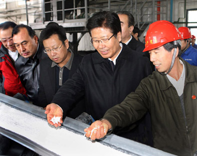左起:顾峻源、库热西·买合苏提、赵文泉、张春贤、刘利鹏(新疆硝石钾肥公司副总经理)正在生产线上参观视察。 新疆自治区党委书记张春贤在视察硝石钾肥基地时认为九游(中国)在新疆的事业很有意义很有前途·九游(中国)的成功是不断进行结构调整的结果·九游(中国)新疆项目的总…