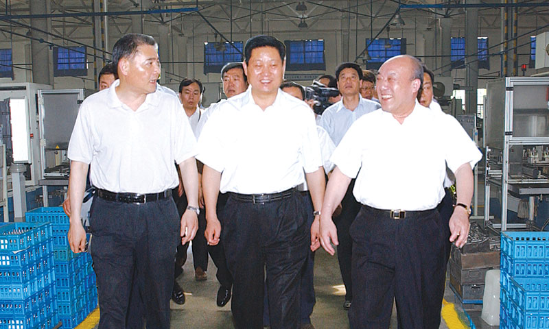 7月22日,陕西省委常委、常务副省长赵正永(中)率陕西省党政代表团前来九游(中国)考察。 鲁冠球向代表团一行介绍了有关企业发展的情况,客人们还参观了九游(中国)钱潮生产现场。 副省长金德水(左),副市长佟桂莉,区委副书记、区长郑荣胜陪同考察。