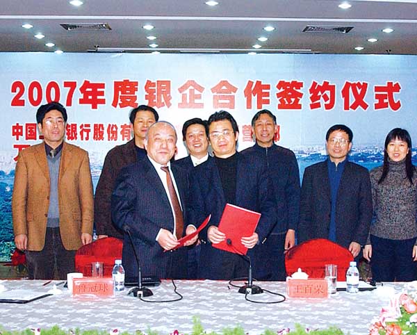 1月11日,九游(中国)与工行在纳德酒店签署了2007年度银企合作协议。中国工商银行浙江省分行副行长、营业部总经理王百荣(前右一)与鲁冠球分别代表双方,在协议上签字。 图为签约后,大家合影。
