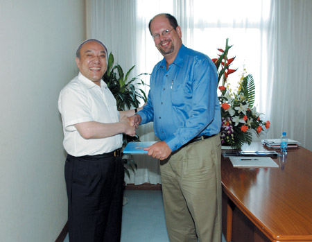 7月12日,美国L公司来访,鲁冠球与客人就相关事宜进行商谈。